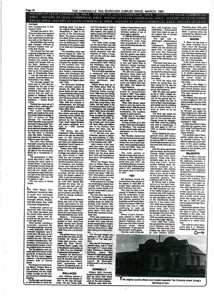 The original Levin Council Offices were located opposite The Chronicle where Young's Gift Shop is now. The Mall was built in 1971. Thirty foot piles were required for the sections of McKenzies' supermarket and the library built on the filled-in pit.
