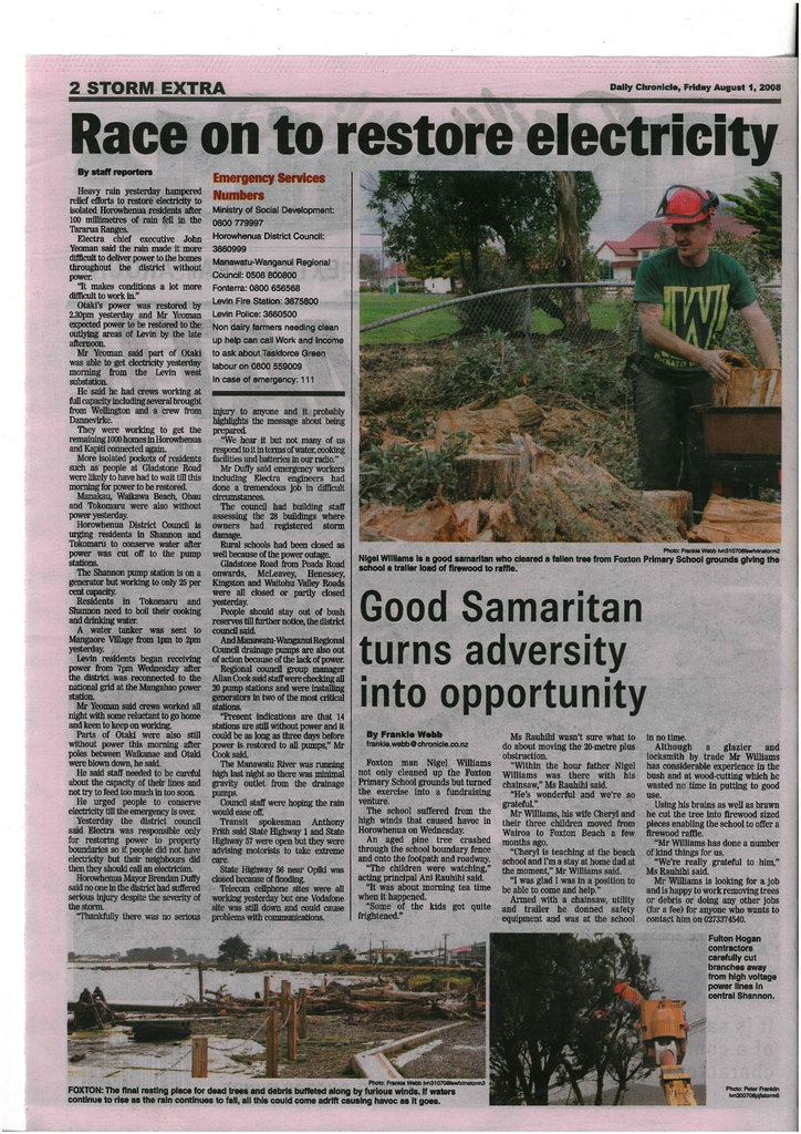 Headline 1: Race on to restore electricity. "Heavy rain yesterday hampered relief efforts to restore electricity tio isolated Horowhenua residents after 100 millimetres of rain in the Tararua Ranges...."