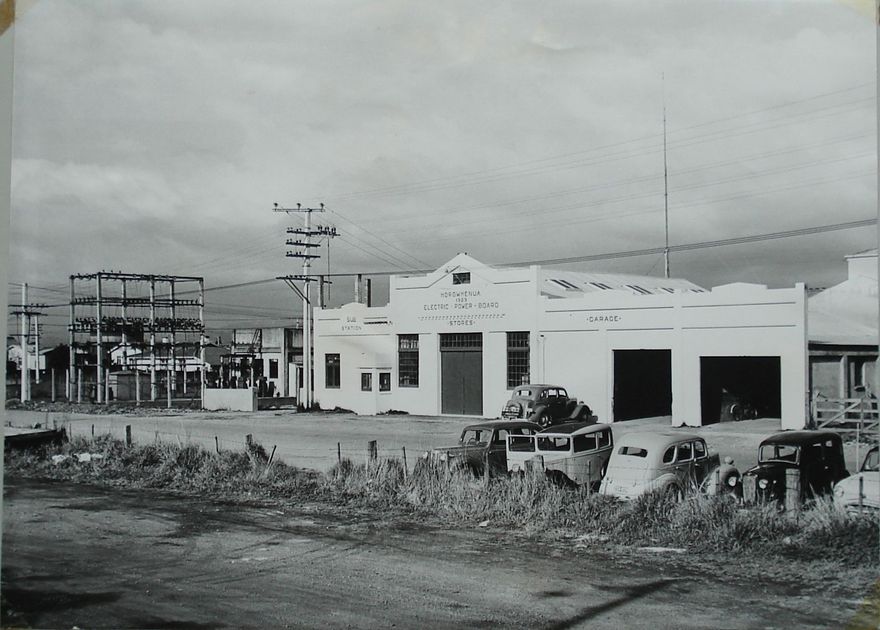 Changes since 1932 photos taken - Additional garage added at right. Sub-station equipment moved to separate area at left with additional building for switch equipment (weathering of this building indicates it was built several years before this photo taken). Additional building has extended the rear of the main building. Communications mast erected at rear of the rear of the main building. Front of the main building has been cleaned & repainted. Concrete power poles have replaced the wooden poles.