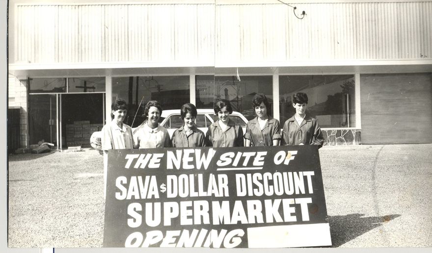 Some of the staff standing outside new building, behind sign announcing - The new site of Sava$Dollar Discount Supermarket. Opening … Pictured – Mrs M. Lewis, Mrs J. Hooper, Mrs M. Dobbin, Miss C. Joyce, Miss S. Carkeek & Miss L. Plimmer.