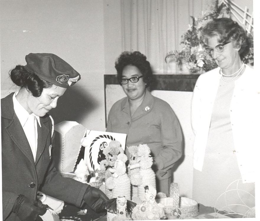 Penciled on back - Some of the handicraft carried out by Levin E.B.R and E.G.R. on display at the Memorial hall when the Rallies celebrates their anniversaries. from left, Mrs T. Graham, & Mesdames M. Williams & E. Green. Mon. May 6, 1968.