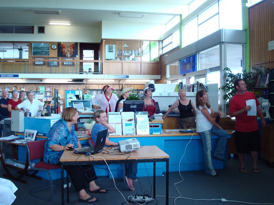 Seated, Pippa Coard and Millie Dewer projected competion entries onto the big screen for everyone to enjoy.