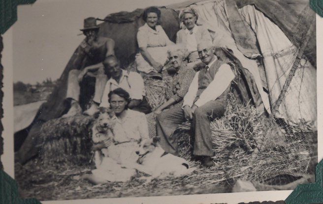 Three men and four women sitting in a hay stack. One woman has one dog tucked under her arm and the other dog is sitting beside her.