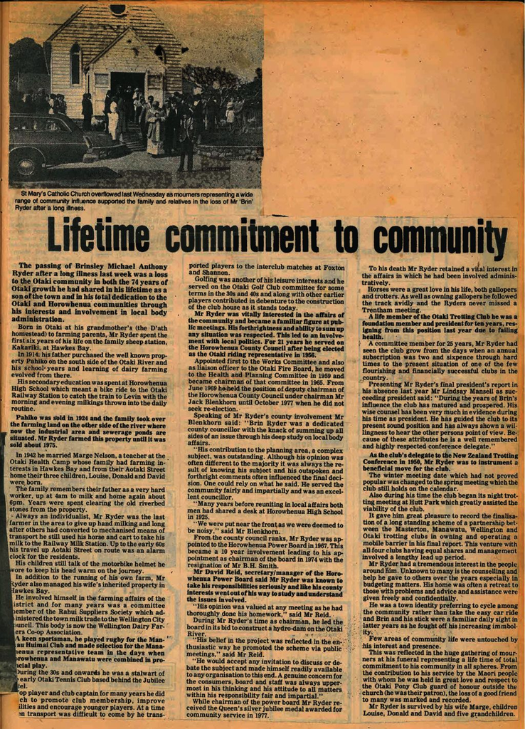 The passing of Brinsley Michael Anthony Ryder after a long illness last week was a loss to the Otaki community in both the 74 years of Otaki growth he had shared in his lifetime as a son of the town and in his total dedication to the Otaki and Horowhenua communities through his interests and involvement in local body administration.Born in Otaki at his grandmother's (the D'ath homestead) to farming parents, Mr Ryder spent the first six years of his life on the family sheep station, Kakariki, at Hawkes Bay.