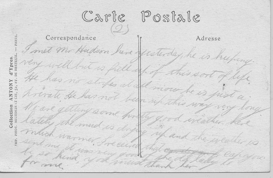 (1) I met Mr. Hudson here yesterday, he is keeping very well but is full up of this sort of life. He has no stripes at all now, he is just a private. He has not been up this way very long. We are getting some pretty good weather here lately, the mud is drying up and the weather is much warmer. I received that cap you sent me, it was very good of the old lady to be so kind, you must thank her for me.