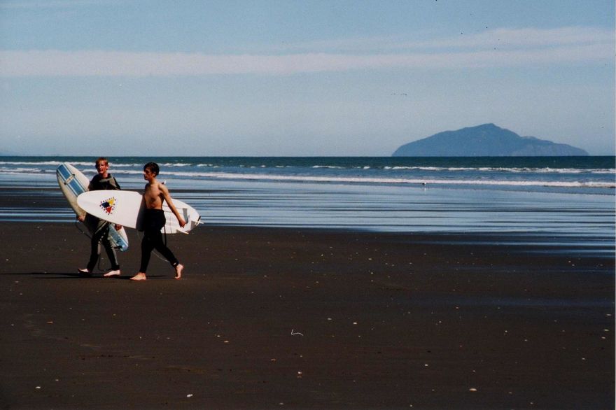 Surfers on Waitarere Beach with Kapiti Island in the background on 17th March 2000