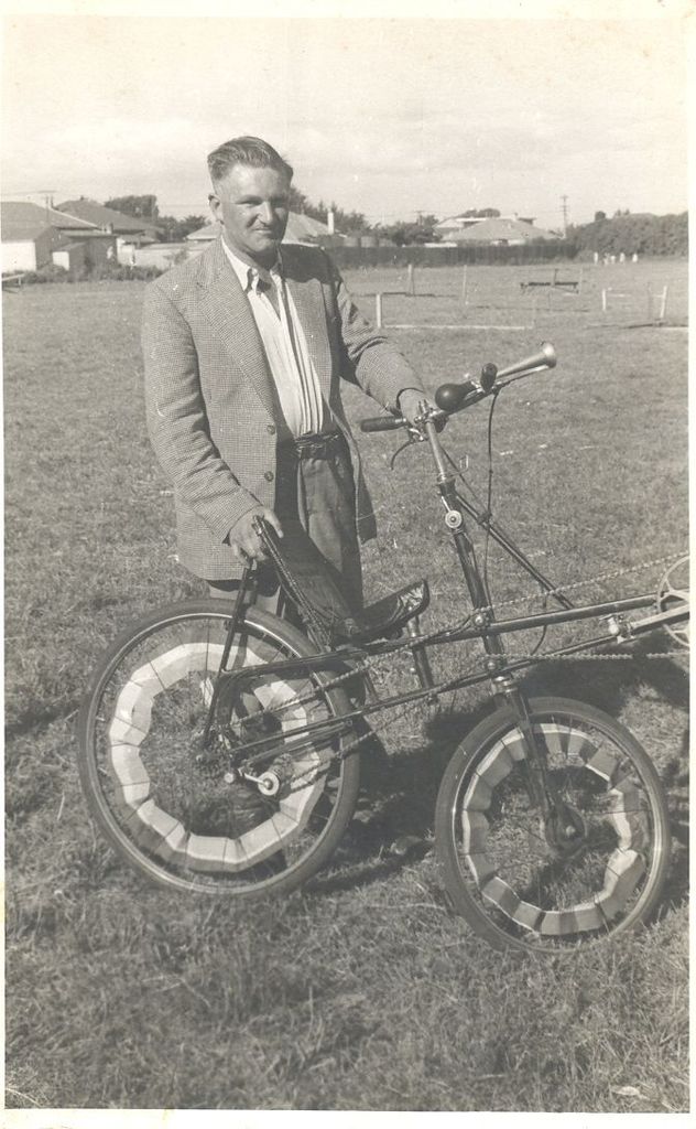 Colin Cochran with unusual bicycle built by R Cochran for 1955 Foxton Centennial Parade