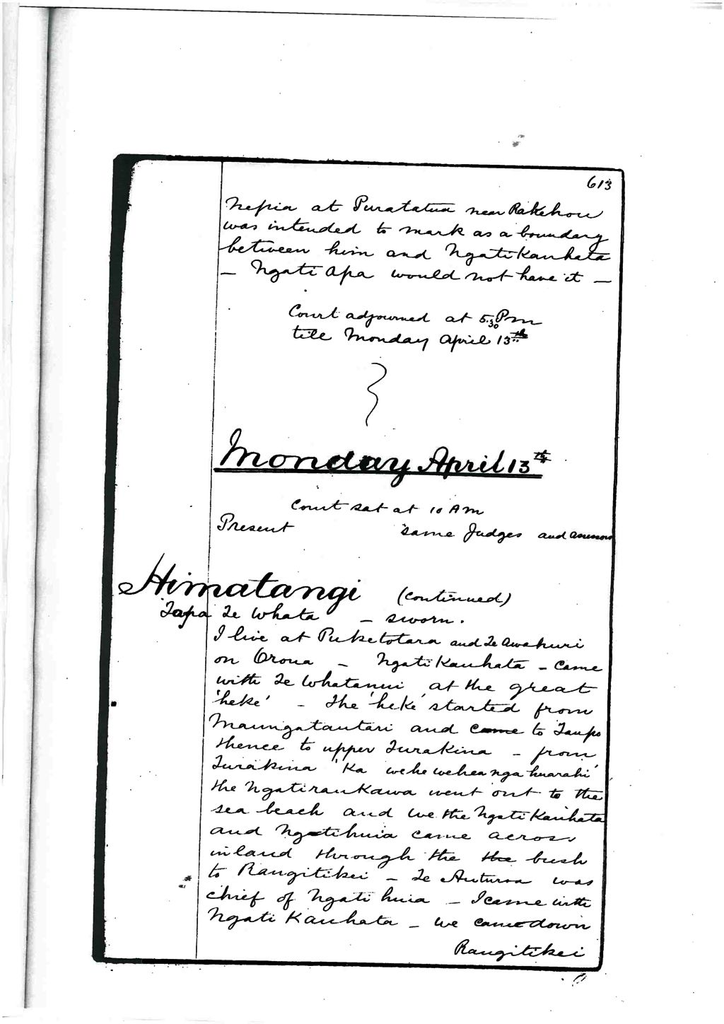 Identified land on plan. Live at Otaki of NgatiRaukawa – a half caste. This land belonged to the ‘tungane’ and ‘matua’ of my mother Erena Rangiwhakairi. The land was given to her. It was hers only during her lifetime. She has been dead 3 years. She left it to me only. There are other children. I am the eldest son. There are 3 younger sons. There are 2 sisters. Mere is my elder sister. ‘Kua moe tane’. Haua is also a sister of mine (‘also moe tane’) – older than myself and younger than Mere. We have other lands. I have sold this land. My brothers and sisters all agreed to the sale. They all shared in the payment which I received. I apply for a certificate that I may have a grant and execute a conveyance. I sold the land to Dr. Hewson and ‘Takuta’ in my application is meant for Dr. Hewson.