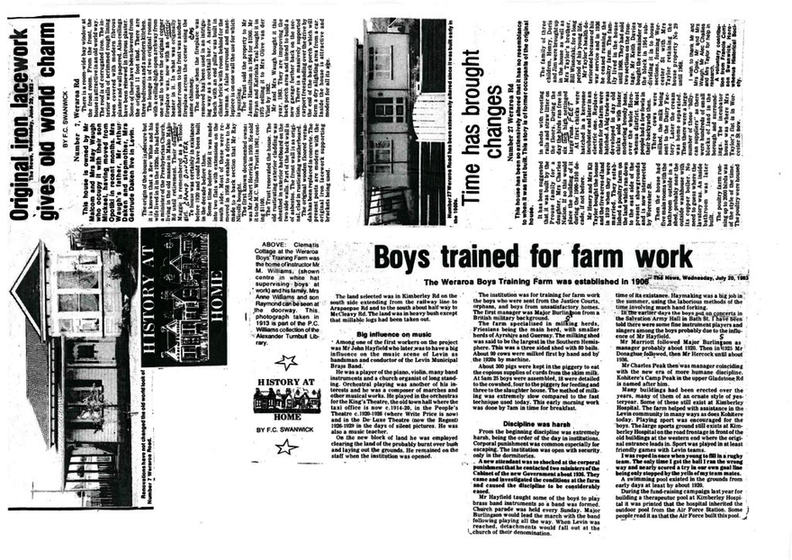 This house is owned by Mr Malcolm and Mrs May Waugh who occupy it with their son Michael, having moved from Opotiki in recent months. Mrs Waugh’s father, Mr Arthur Daken and stepmother, Mrs Gertrude Daken live in Levin. The origin of the house is obscure but it is known that a Rev. White and his wife lived in it in the 1920s. He had been a minister of the Presbyterian Church, living in the old manse in Mako Mako Rd until retirement. Their grand- daughter Maggie is remembered as a school girl.