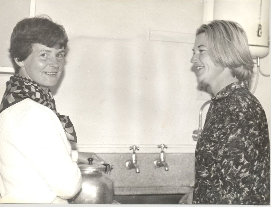 Two women (unidentified) preparing to make a large pot of tea 1 B&W photo print