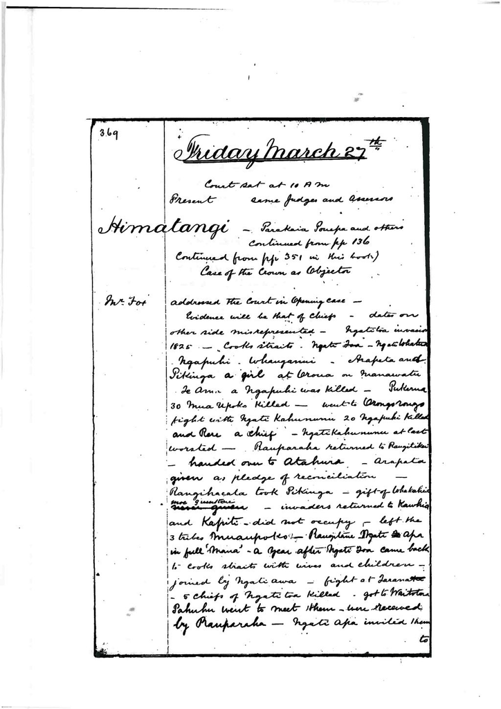 evidence will be that of chiefs – dates on other side misrepresented – Ngati Toa invasion 1825 – Cook Straits , Ngati Toa – Ngatiwhatua, Ngapuhi, Whanganui – Arapeta and Pikinga a girl at Oroua on Manawatu – Te Ama a Ngapuhi was killed – went to Orongorongo fight with Ngati Kahungunu at last worsted – Rauparaha returned to Rangitikei – handed over to Atahura – Arapata given as pledge of reconciliation – Rangihaeata took Pikinga – gift of Whakahuia [unknown words] – invaders returned to Kawhia and Kapiti – did not occupy – left the 3 tribes Muaupoko – Rangitane – Ngati Apa in full ‘mana’ – a year after Ngati Toa came back to Cooks Straits with wives and children – joined by Ngati Awa – fight at Taranaki – 5 chiefs of Ngati Toa killed – got to Waitotara – Pahuhu went to meet them – were received by Rauparaha – Ngati Apa invited themPage 370