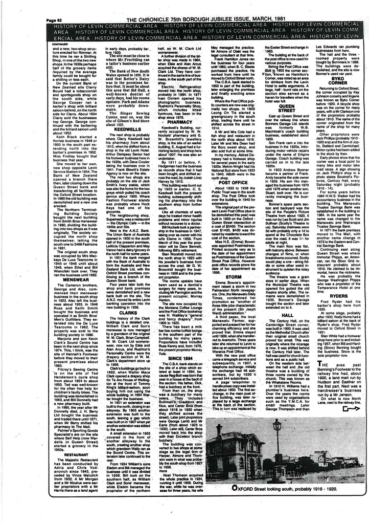 She moved to her own, new shop opposite Levin Service Station in 1954. The Bank of New Zealand opened a branch there then, later closing down the Queen Street bank and transferring all facilities to the Oxford Street location. In 196o theold building was demolished and a new one erected.