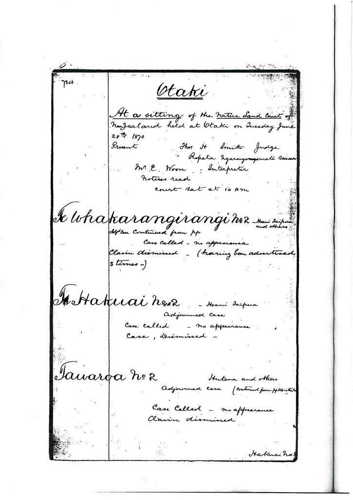 20 Ngatitoa chiefs (some named) ‘nana tana mahinga’. Evidence as to clearing of bush by Ngatitoa before Haowhenua. A portion given by Tungia to Te Aho Aho and Matangi. 5 years before Haowhenua. We were away at Kapiti when the fighting began. After Waikato came we returned not to Pakakuta but to Haowhenua. One of my ‘matua’ was killed at Haowhenua ‘kotahi to po ki Haowhenua’. Returned to Kapiti and then crossed to Waikanae to help Ngatiawa to build ‘pa’ at Kena Kena. Haowhenua – Otaki ‘pa’ was left by Ngatiraukawa and Rauparaha and the ‘pa’ was burnt by Ngatiawa. I and my ‘matua’ followed Rauparaha to Ohau and stopped him from going. He was on the way to Maungatautari. Took Ngatiraukawa chiefs and Rauparaha back to Kapiti – Te Kuititanga. Hadfield came in 1859. The year before Kohimarama. I came to Otaki to be near church and asked Kingi Te Aho Aho for a ‘mahinga kai maku’. I asked him because he was a relative of Wikitoria – sister of Tungia who was occupying there. Wikitoria objected and asked why he did not give some other piece. He said ‘kia hoki to kotiro ki to korua wahi ano’. I took fencing there and some of the Ngatiraukawa people went and began to mark off boundaries there. Ther was a scuffle and Maika of Ngatiraukawa got hurt and ‘mate noa iho’.