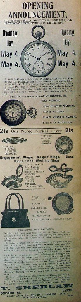 In justice to myself and for the information of the public who don't seem to know me by repute, and more especially those connected with the trade who have been endeavouring to circulate to circulate statements witha view to damaging my reputation, I may state that the twelve years prior to my coming to Levin two years ago, I was in business in Wellington - not as a "practical" watchmaker, but as a watch expert, and during those twelve years I had customers in almost every town from Auckland to Dunedin, and in many instances doing watch-work for them that could not have been executed elsewhere in this Dominion.
