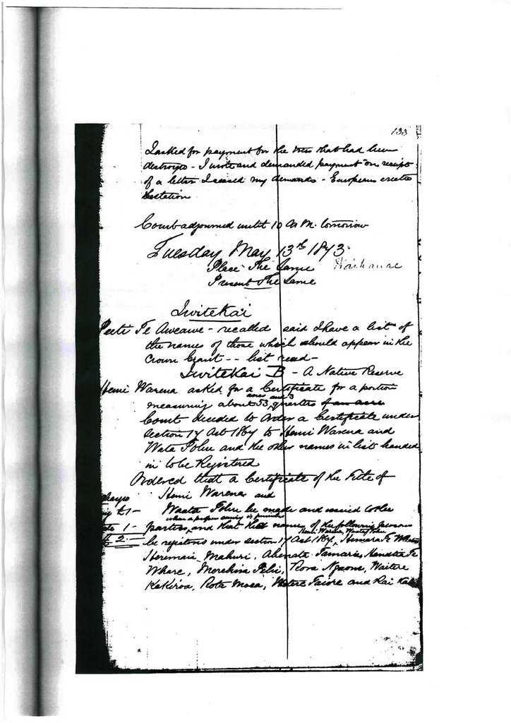 be made and issued to the parties when a proper survey is furnished and that the names of the following persons be registered under section 17 Act 1867 Hemi Warena, Waata Tohu, Hemara Te Whetu, Heremaia Mahuri, Ahenata Tamaru, Hanatia Te Whare, Merehira Pehi, Rora Ngaone, Waitere Kakiroa, Rota Moea, Watere Taiore and Rai Kahu.