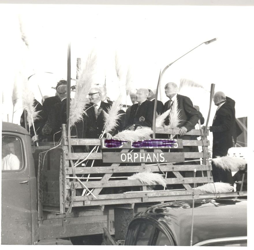 Sign on truck used as float – Lord Lambton’s Orphans. Many of the men are wearing stocking type masks on their heads.