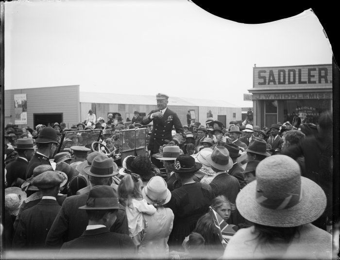 Lord Jellicoe amongst a crowd, during his visit to Levin. Photograph taken by George Leslie Adkin, 29 November, 1921. Many in the crowd wear hats. The business premises of J W Middlemiss, saddler, is in the background.