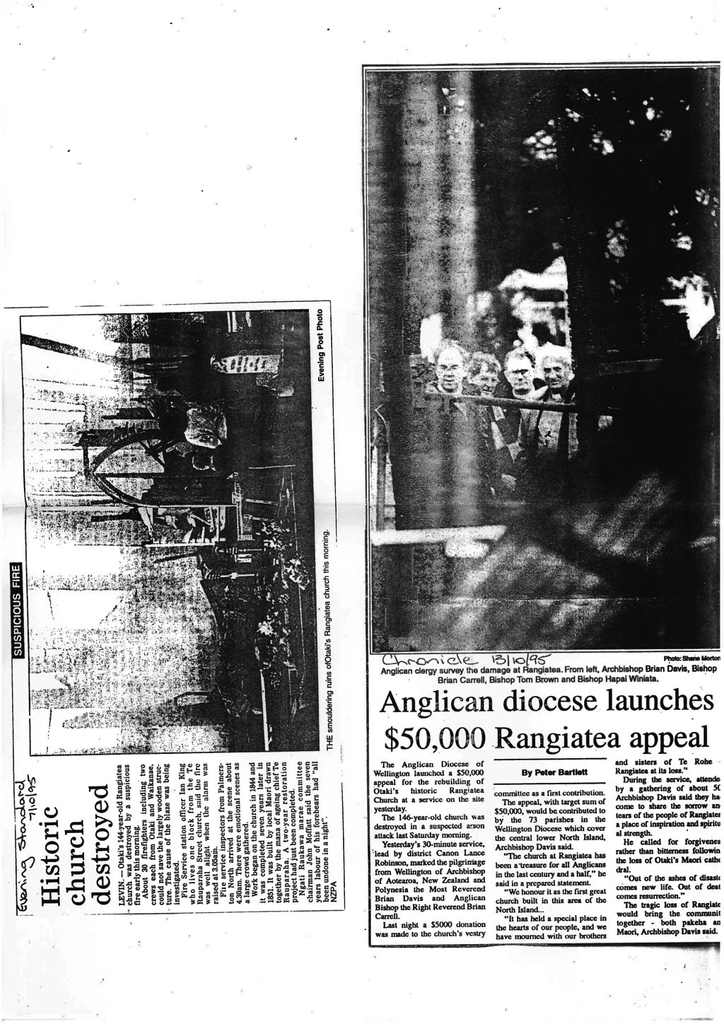The Anglican Diocese of Wellington launched a $50,000 appeal for the rebuilding of Otaki's historic Rangiatea Church at a service on the site yesterday. The 146-year-old church was destroyed in a suspected arson attack last Saturday morning. Yesterday's 30-minute service, lead by district Canon Lance Robinson, marked the pilgrimage from Wellington of Archbishop of Aotearoa, New Zealand and Polynesia the Most Reverend Brian Davis and Anglican Bishop the Right Reverend Brian Carrell.