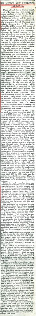Upon a knoll, down Queen street, west of Levin, a large two-storey residence has been erected for Mr W. G. Adkin - a gentleman well known to Wellington citizens and to country settlers, owing to his connection with the prosperous firm of Warnock and Adkin, drapers, &c. A few years since Mr Adkin secured 300 acres of excellent land close to Levin, and, it being well watered, and pleasantly situated, he looked forward to the time when he would retire from the din and rush of business to the quiet of a country seat. With this object in view Mr Adkin steadily worked towards it; he improved the land, and not long since he commenced to build a residence which, in many respects, has not its superior on this coast.