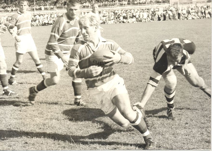 Penciled on back - All Black 1/2 back, C.R. Laidlaw skips through Hawke’s Bay defence during the 75th jubilee game of the H.R.U. Mon. April 8, 1968.
