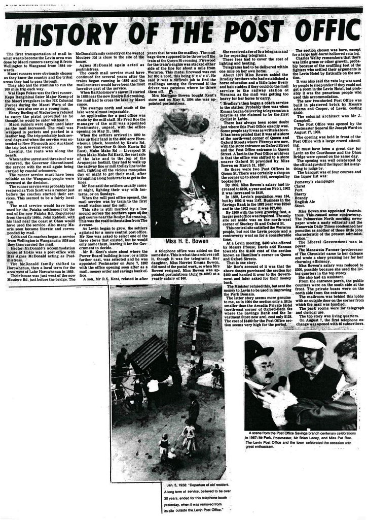 Miss Bowen was appointed Postmistress. This caused some controversy. The Palmerston North morning newspaper wrote a nasty editorial and the Manawatu Daily Times condemned her promotion as another of those little jobs characteristic of the present administration. The Liberal Government was in power.