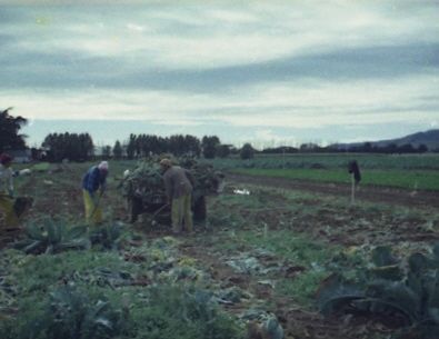 Harvesting vegetables, probably at Horticultural research Station. Any use of this image must be accompanied by the credit: Horowhenua Historical Society Inc.