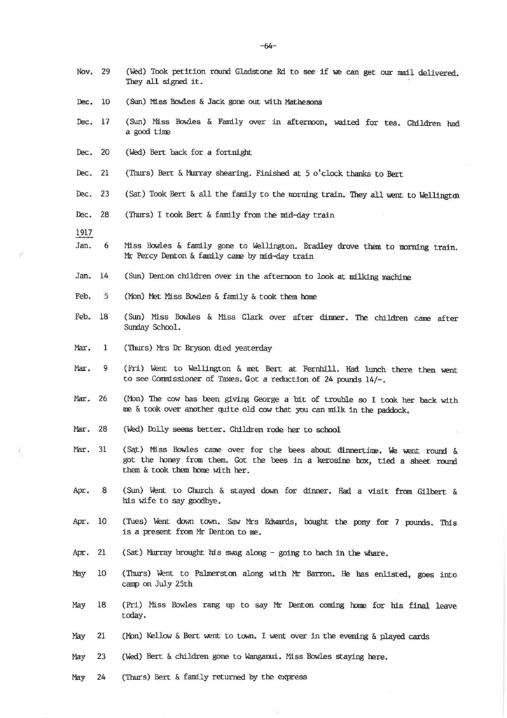 Miss Bowles & family gone to Wellington. Bradley drove then to morning train. Mt Percy Denton & family came by mid-day train Jan. 14 (Sun) Denton children over in the afternoon to look at milking machine Feb. 5 (Mon) Met Miss Bowles & family & took them home Feb. 18 (Sun) Miss Bowles & Miss Clark over after dinner. The children came after Sunday School. Mar. 1 (Thurs) Mrs Dr Bryson died yesterday Mar. 9 (Fri) Went to Wellington & met Bert at Fernhill. Had lunch there then went to see Commissioner of Taxes. Got a reduction of 24 pounds 14/-. Mar. 26 (Mon) The cow has been giving George a bit of trouble so I took her back with me & took over another quite old cow that you can milk in the paddock. Mar. 28 (Wed) Dolly seems better. Children rode her to school Mar. 31 (Sat) Miss Bowles came over for the bees about dinnertime. We went round & got the honey from them. Got the bees in a kerosine box, tied a sheet round them & took them home with her. Apr. 8 (Sun) Went to Church & stayed down for dinner. Had a visit from Gilbert & his wife to say goodbye. Apr. 10 (Tues) Went down town. Saw Mrs Edwards, bought the pony for 7 pounds. This is a present from Mr Denton to me. Apr. 21 (Sat) Murray brought his swag along - going to bach in the whare. May 10 (Thurs) Went to Palmerston along with Mr Barron. He has enlisted, goes into camp on July 25th May 18 (Fri) Miss Bowles rang up to say Mt Denton coming home for his final leave today. May 21 (Mon) Kellow & Bert went to town. I went over in the evening & played cards May 23 (Wed) Bert & children gone to Wanganui. Miss Bowles staying here. May 24 (Thurs) Bert & family returned by the express May 25 Fri. Drove Bert & his family down to a send off concert. May 28 Mon. Bert & I decided to pipe drain the bathing hole paddock, if the price is reasonable. We all drove down in the afternoon to say goodbye. Big crowd there. May 30 Wed. Miss Bowles had a wire from Mr Denton might be sailing tomorrow. I decided to take them all dawn to Wellington. We stayed at the Arcadia. May 31 Thurs A day not to be forgotten. We got to the station a little before ten. The train the troops came by did not arrive till 4.30. However, the children saw a good deal of their father & stuck to him till he got on board. June 1st 1917 to April 26th 1919 Notes written by Mr W. Stewart while Bert overseas. June 1 Fri. Returned from Wellington by mail train after seeing Bert away. Miss Bowles and chn had dinner here. After dinner I drove them home. June 4 Mon. Percy Denton at Denaby. June 7 Thurs Miss Denton left by afternoon train. June 11 Mon. Murray digging out drain in bathing hole paddock. June 12 Tues. Bought light steers. Good South Island steers at £8/14/-. June 14 Thurs Miss Bowles got the Phatoen [phaeton] from Macintosh. June 16 Sat.