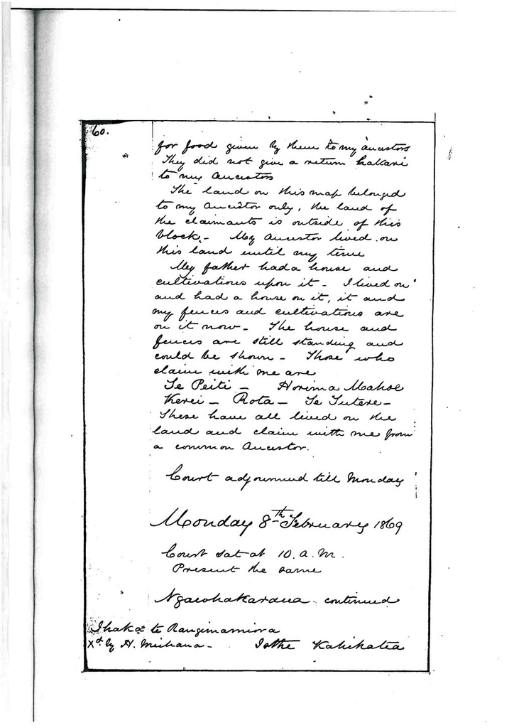 Tireo used to snare birds upon this land, he did not live permanently on it but used to go there in the season for birds. None of my ancestors did anything on this land after this time until the days of my father Te Aweawe. Te Aweawe did not go on to the land or exercise any right of ownership over it until 1857. He my mother and I then went on to it, and ki runga ki nga mahinga a te Pauroa ma. Tupunas of mine (tupuna hou no inaianei nei). We went to plant on this clearing. He and I staid there until 1858 and then left, the men who made the clearing were