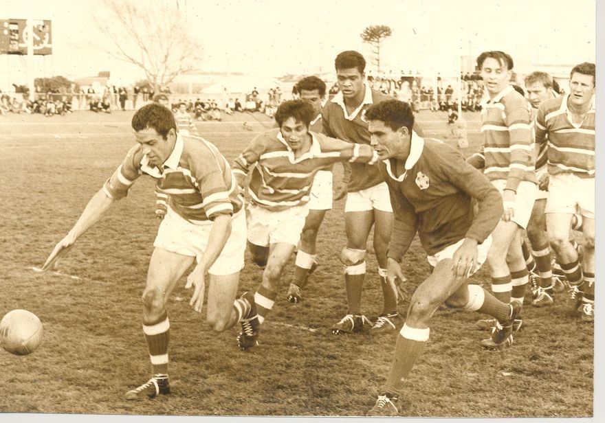 Penciled on back - Horowhenua vs Tongan Rugby match in action. Thurs. Aug. 21, 1969.
