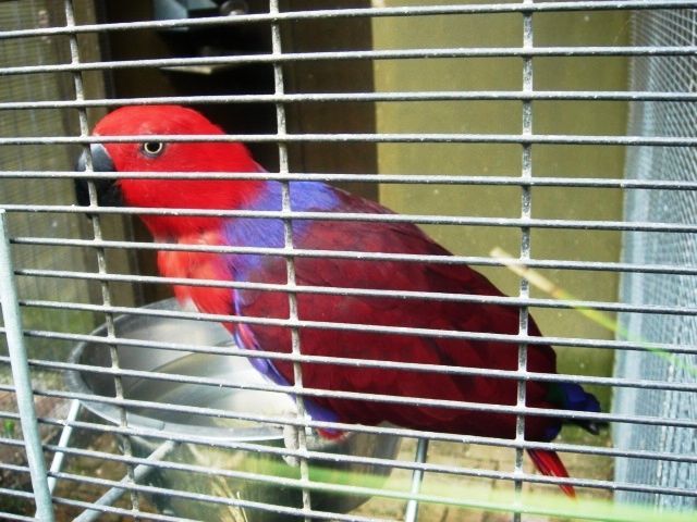 This is a Female Eclectus Parrot, they are native to Indonesea and both sexes have stunning colours. The females are red and purple and the males are bright green and blue with a bright orange beak!