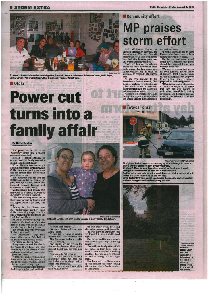 Headline 2: MP praises storm effort : "Otaki MP Darren Hughes has thanked emergency services, the Horowhenua DIstrict Council, Electra and locals who are pitching in to deal with thre consequences of this week's extreme weather ..."