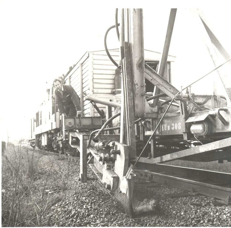 Laying cable in the ‘ballast’ along-side railway line by cable layer mounted on railway wagon pulled by diesel locomotive. Workmen (unidentified).