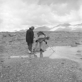 Dr R Balham and P Webb examine a shallow pool at the head of Victoria Valley.