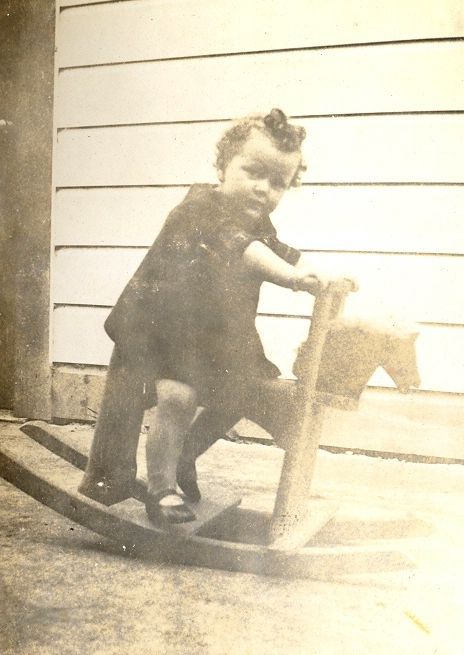 Lorna Ransom seated on a rocking horse probably aged about 3 years.