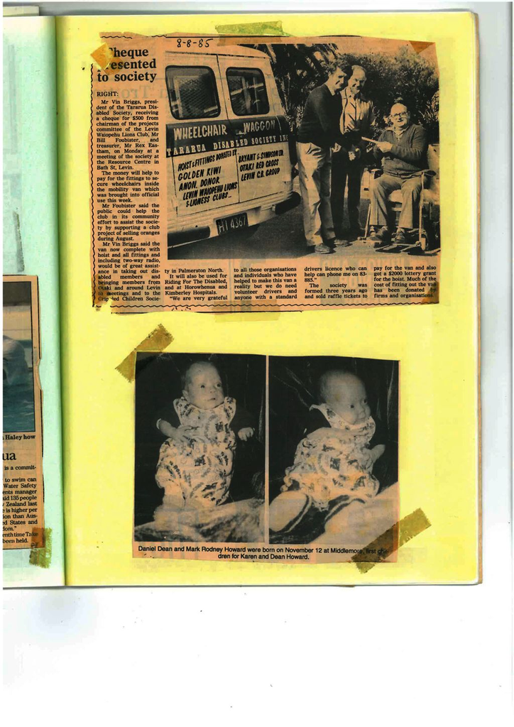 Photo 1: Mr Vin Briggs, president of the Tararua Disabled Society, receiving a cheque for $500 from chairman of the projects committee of the Levin Waiopehu Lions Club, Mr Bill Foubister. 8 August 1985.