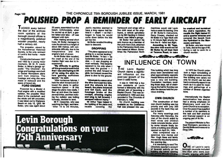 The propellor, stored by the Horowhenua Historical Society, is the only remnant of Levin's first home - made plane.