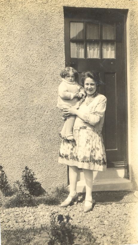 Holding the baby. A young woman holding a child outside the door.