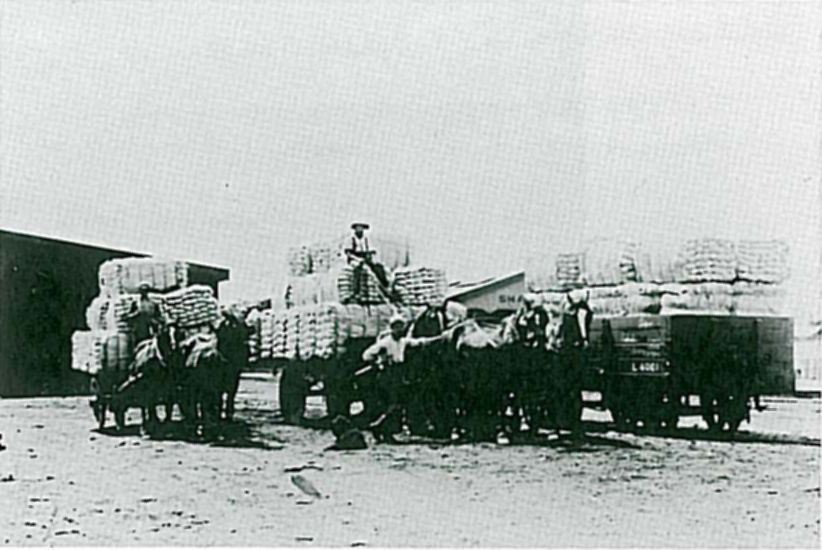 Unloading bales of "Miranui" fibre at the Shannon railway station.