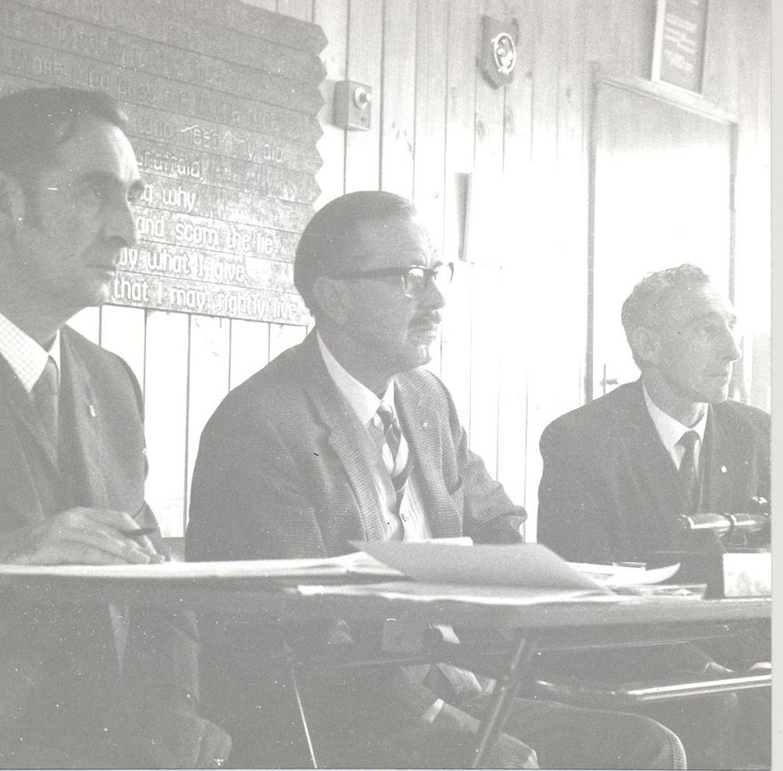 Penciled on back - Delegates at the national council meeting of the Scout Assn. of N.Z. at Tatum Park. from left, Messrs A. Crowther (national sec.), Air Vice- Marshal I.G. Morrison (deputy Chief Scout) & A. Patterson (chief executive commissioner). Mon. May 31, 1971.
