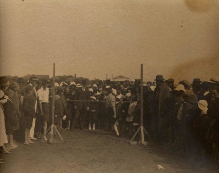 Athletic sports at Manawatu heads in c1920. A crowd of spectators is watching competitors take part in the high jump event.