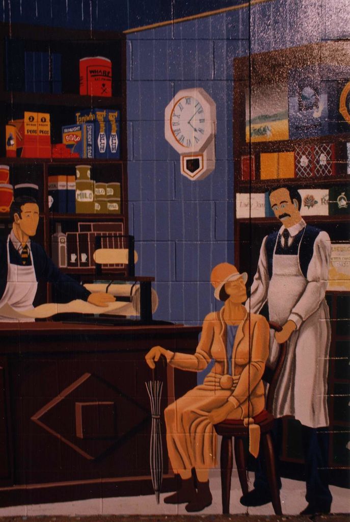 Mural of Baukham’s shop which was on the corner of Main and Clyde Streets, Foxton in 1926