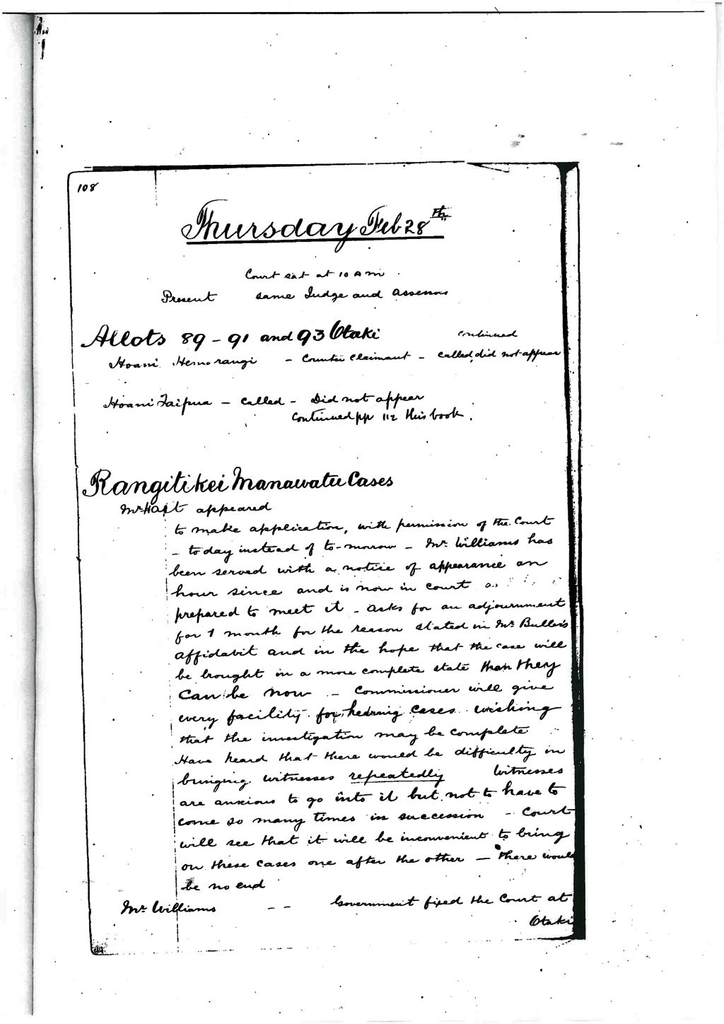Mr. Williams – Government fixed the court at Otaki. This is the third time the counsel for the crown has been here to throw obstacles in the way. The Gazette notices show that the government with that there should be an investigation. I don’t know anything about the commission. The lands are said to be those of the crown. It refers to Mr. Buller’s affidavit. It was brought forward in support of application for adjournment to Rangitikei. Mr. Hart referred to affidavit in support of present application. Witnesses “not willing to come to Otaki”. Yesterday Mr. Buller told the R