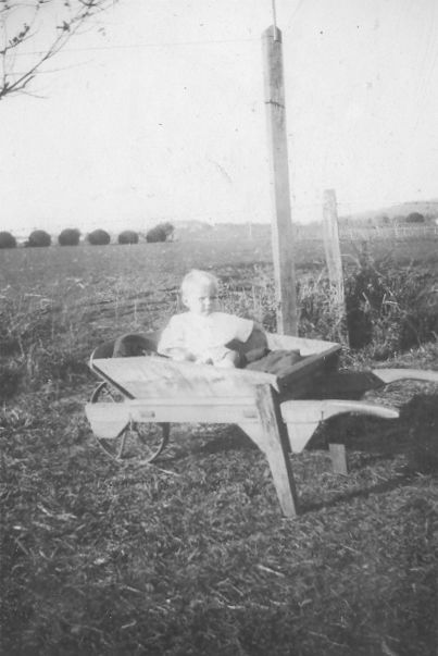 Reg Sutton aged 11 months, sitting in a wooden wheelbarrow.
