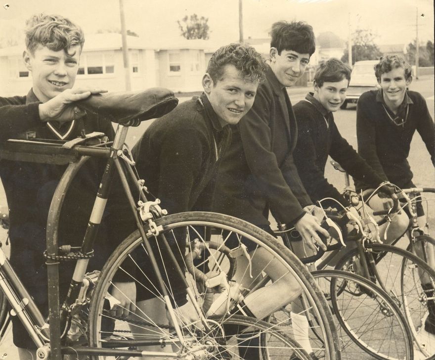 Penciled on back - The members of the Horowhenua College cycling team who will compete in the inter-college Sir Bernard Fergusson cycle race of 10 miles. from left: Terence Watson (capt), John Adin, Raymond Hooper, Colin Kimmins and Barry Hyndman. Reserves, not shown, David Richardson and Ross Windley. Thurs. Aug. 14, ‘69.