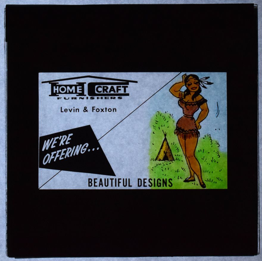 Advertising certainly has changed! Homecraft Furnishers has a range of cinema slides uploaded on Kete and most of them have some rather offensive (and in this case sexist) depictions of Native Americans.