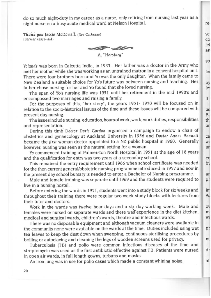 Yo commenced training at Palmerston North Hospital in 1951 at the age of 18 years and the qualification for entry was two years at a secondary school.