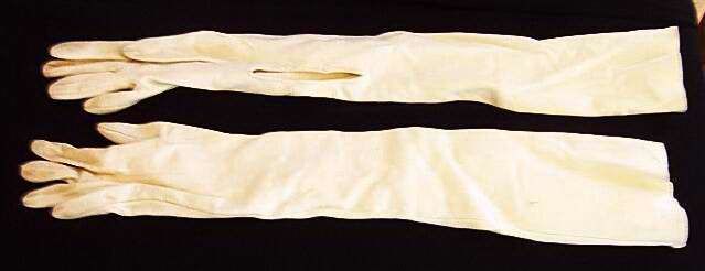 One pair long white suede gloves. One button is missing on the left glove.