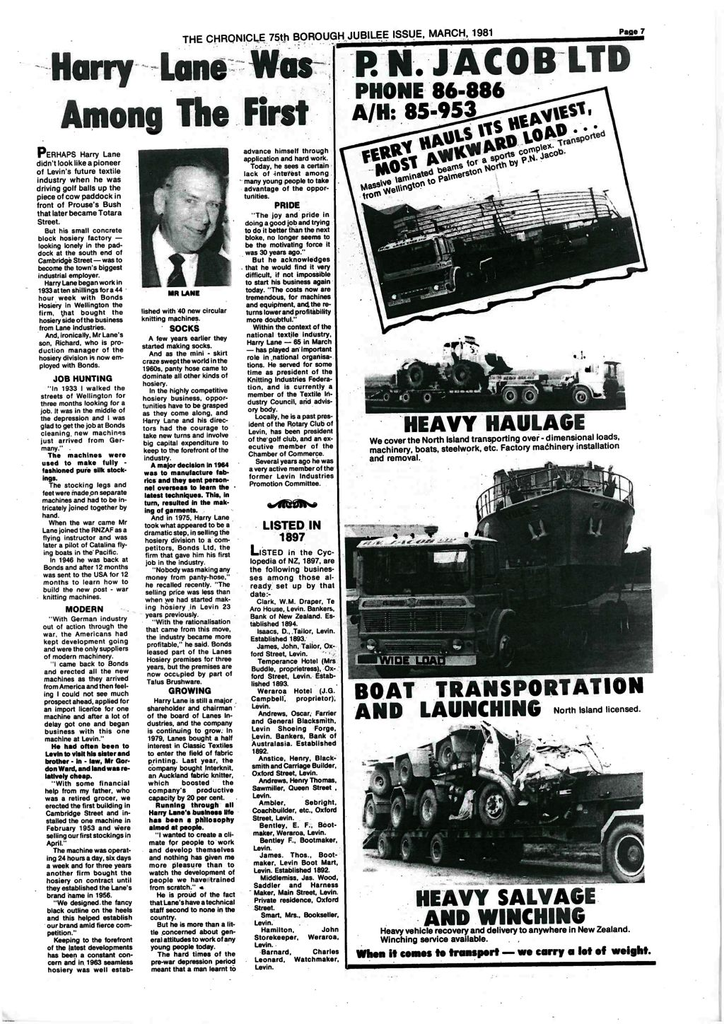 Harry Lane was among the first:Perhaps Harry Lane didnt look like a pioneer of Levin's future textile industry when he was driving golf balls up the piece of cow paddock in front of Prouse's Bush that later became Totara Street.
