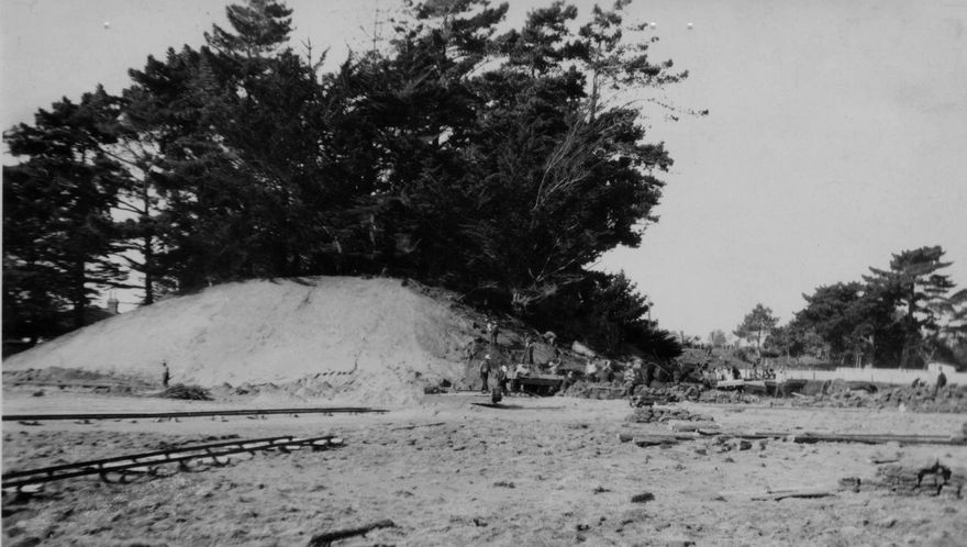 Site preparation for Woolpack and Textiles factory. A sandhill with large marcocarpa trees on top in the centre of the photograph has been half demolished.