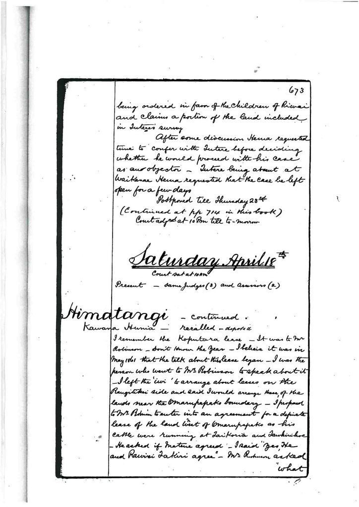 I remember the Koputara lease. It was to Mr. Robinson. I don’t know the year. I believe it was in May 1861 that the talk about this lease began. I was the person who went to Mr Robinson to speak about it. I left the ‘iwi’ to arrange about leases on the Rangitikei side and said I would arrange these, of the lands near the Omarupapato boundary. I proposed to Mr Robinson to enter into an agreement for a definite lease of the land west of Omarupapako as his cattle were running at Taikoria and Tawhirihoe. He asked if Matene agreed. I said “Yes, he and Rawiri Takiri agree”. Mr. Robinson asked “What terms”. I asked for £100 per annum. Mr. Robinson said “ae, hei Taikoria te rohe”. I said “Taikoria is being arranged about by Ratana and Mr. Churton”. I proposed Paepae as a boundary ‘mo korua ko Te Kuka’. Robinson wanted Kaikokopu and Koputaura. I told him I had promised that to Mr. Cook. Robinson then proposed £40. I did not agree. Robinson made a proposal £40 and to increase £10 – increase up to £100. I returned. I had discussion with Matene and Rawiri. I said I will speak to Nepia lest he should say we are stealing his rents of Te Awahou. There was an old lease to Robinson of Awahou. I went and saw Nepia at Matahiwi. I told him we were going to lease Koputaara near Kaikokoppu on to Manawatu. He said it is well. Nepia and I talked over the matter. Nepia spoke of Matene and said “is he angry with his mokopuna?’ – referring to young Nepia). He referred to old differences with Hakeke and himself as to boundary. The former claiming Kariiri, and he, Koputaara as the boundary. I laughed and said “the question of admitting young Nepia is with Matene”. I said “I am looking ‘titiro pitaha ki a Ngati Rakau”. Nepia said “You are right, but what is Taraotea’s ‘tohe ki Himatangi?, he aha ra tona tikanga”. (Referred to Taraotea’s going to get ‘ti’ at Himatangi and Matene’s going and burning houses). “What object have Ngati Rakau”. “This is the same as he did with Ngati Te Upoko-iri who ‘pana’ him from places where he went to get birds”. After this Nepia and I and Hamuera and Matene and other Ngatiapa went to Awahou to Mr. Robinson. Kuruho was there with us at this meeting. Nepia urged Robinson to accept terms offered by Ngatiapa - £100 a year. Nothing settled. We returned. Left the ‘kaumatua’, at Koputaara. Nepia and I returned. Went into the matter with Robinson again. Asked for rent for time the cattle had been running. Robinson gave £10. Gave Nepia £5 and kept £5. I then agreed to the lease for £40 for 1st year. Week after , 40 of us came down and settled the matter and signed leases. Kaikokopu, Mr. Cooks lease and Koputaara to Manawatu to Robinson. No other Ngatiraukawa besides joined in this lease at first. I did not name Parakaia. I did not invite Parakaia.